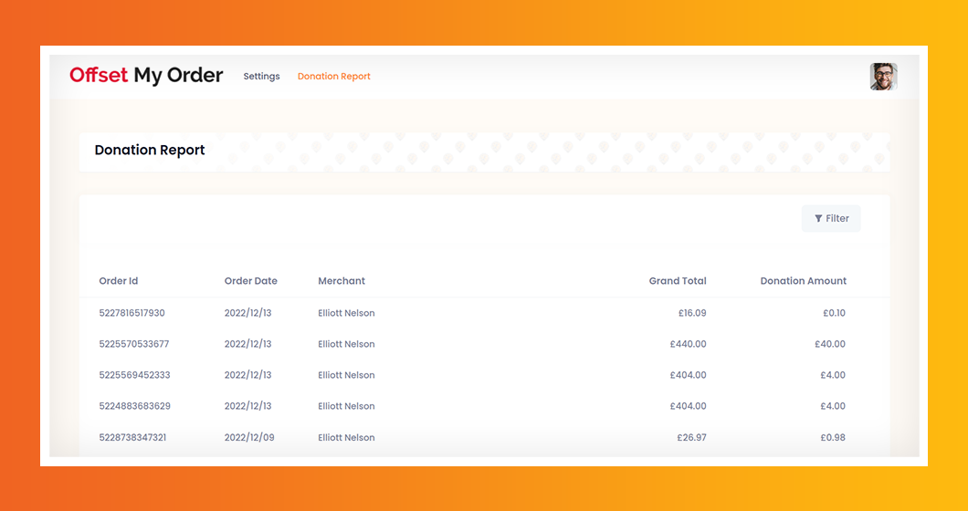 Merchants can see their store’s collected donations in this section with order number, date and amount.