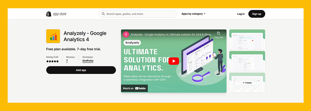 Analyzely is a powerful app that integrates Google Analytics 4 with your Shopify store. It provides you with real-time data and insights that help you to understand your customers better. The app also helps you to track your marketing campaigns, sales, and revenue.
