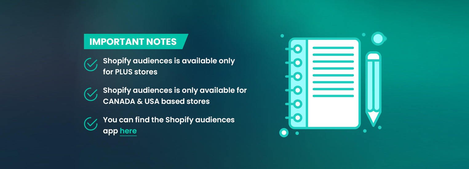 Step 1: Check eligibility: If you are a US or Canada-based merchant with a Shopify Plus store and use Shopify payments, you are qualified to set up the Shopify Audiences tool.