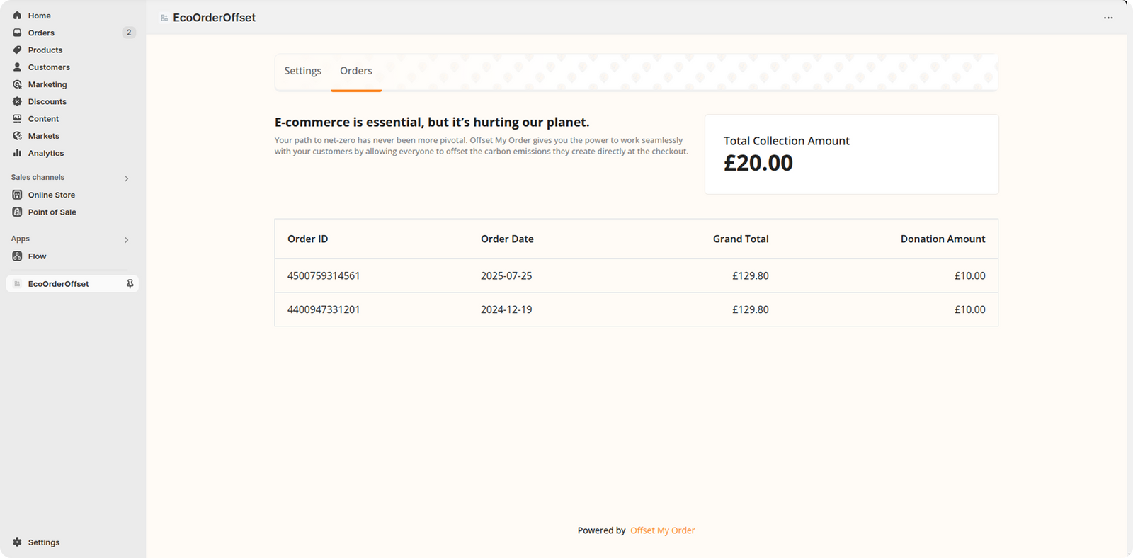 EcoOrder Offset is a sustainability-focused Shopify app designed to allow your store and customers to contribute to a greener planet. With seamless integration, customers can opt to offset the carbon footprint of their order through impactful green initiatives, such as tree planting and renewable energy projects. EcoOrder Offset is simple, transparent, and effortless—making green choices easy for every purchase.